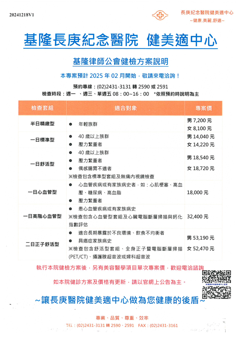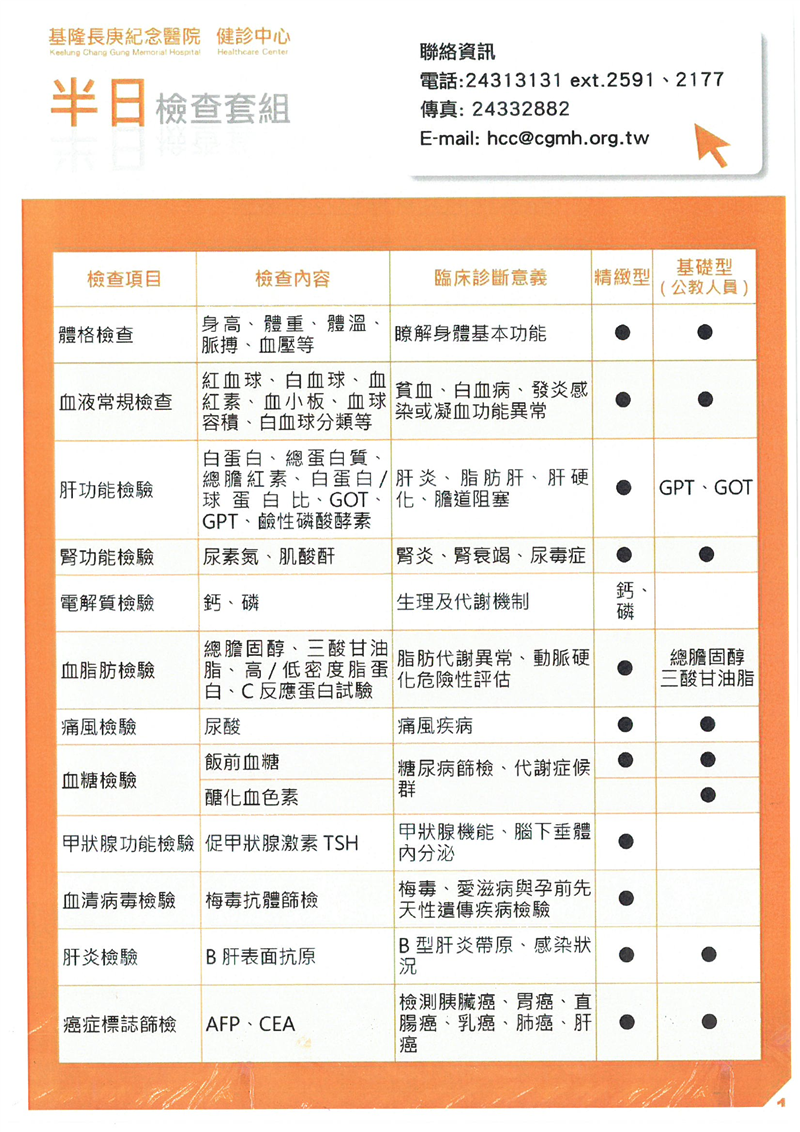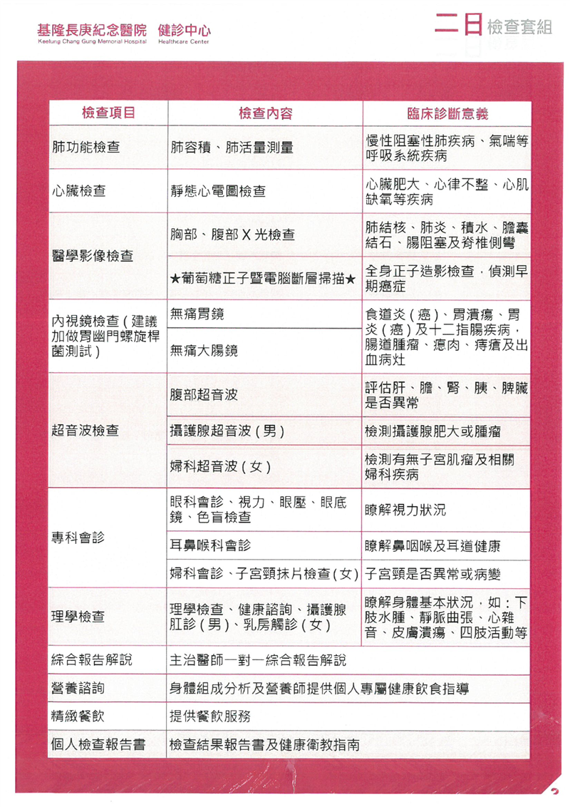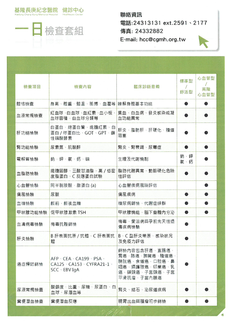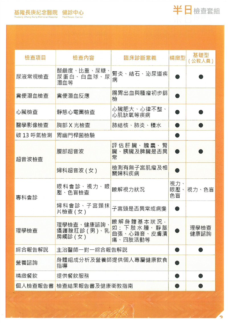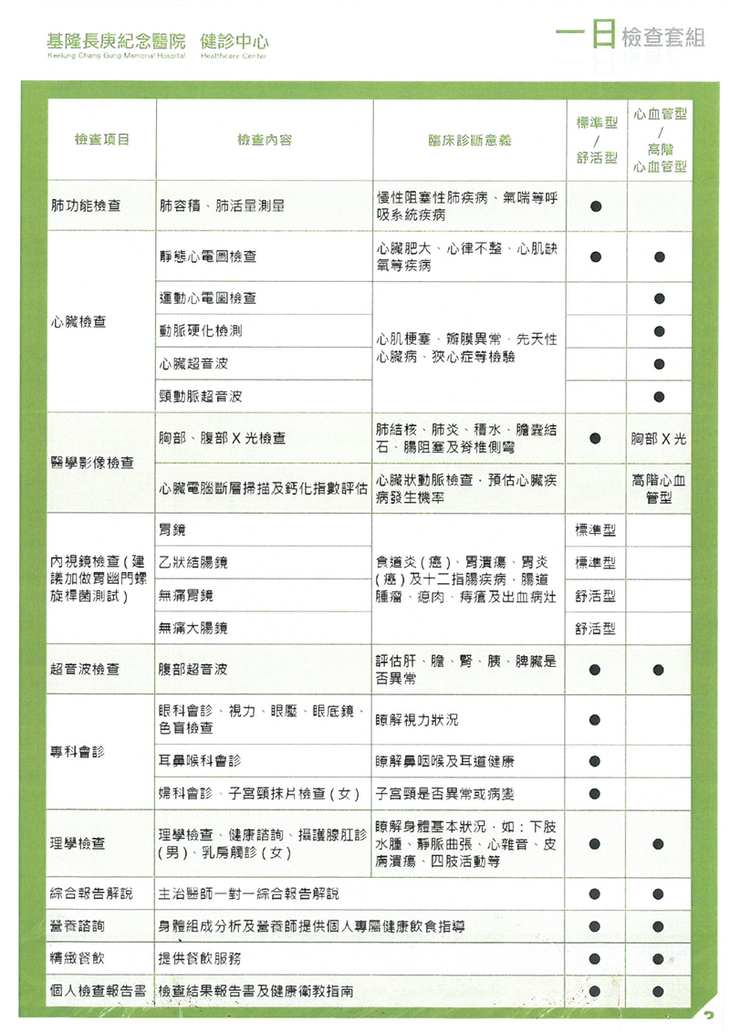 ●檢查套組:半日精緻型、一日標準型、一日舒活型、一日心血管型、一日高階心血管型、二日正子舒活型 (總共有6種套組可選擇) 以上6種套組之費用皆已有優惠,各項套組的專案價費用請參閱附件檔案依照檢查套組的名稱所示 (限本會一般會員及特別會員)。