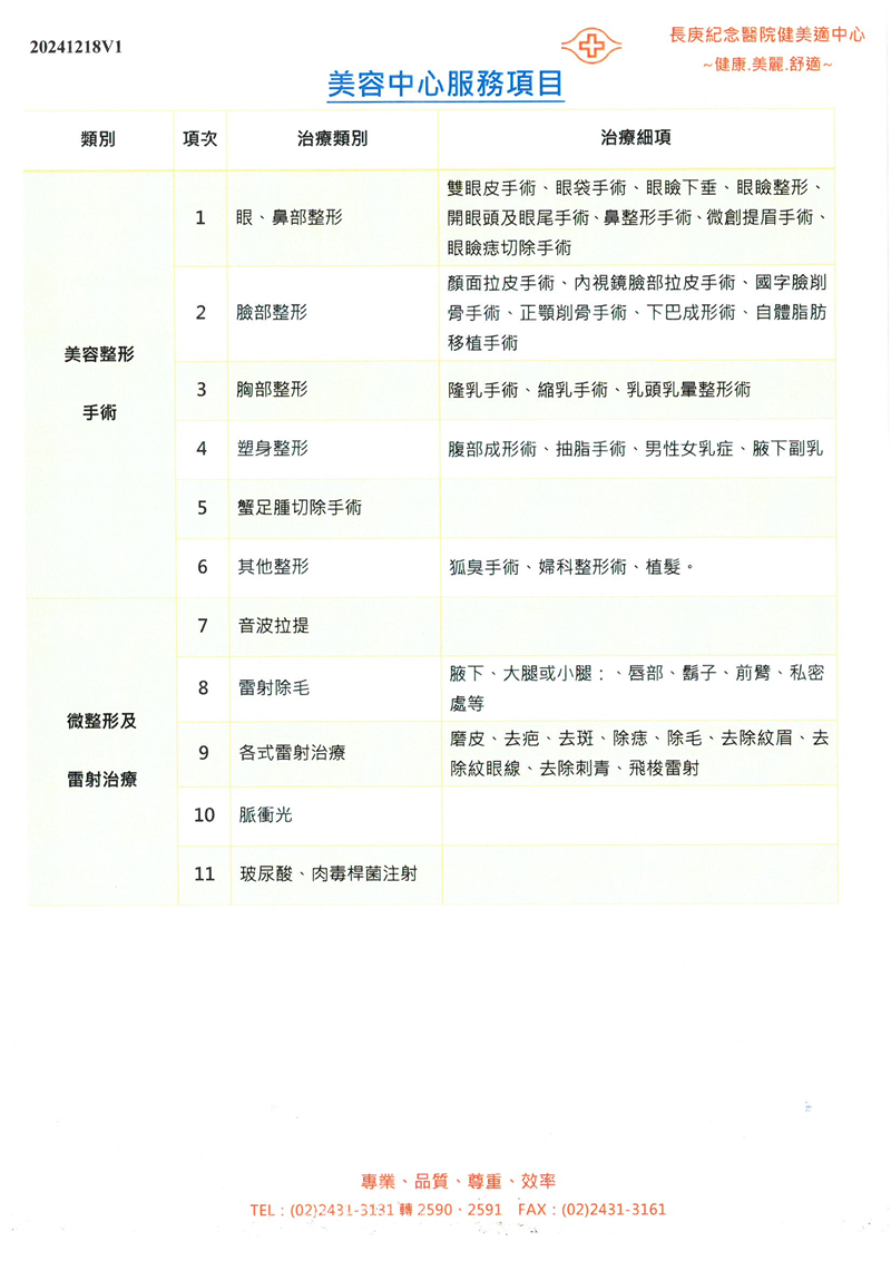 ●醫美:美容中心服務項目可參閱附件檔案內所示 (因醫美較特殊需要親自實際門診後由醫生告知適合的方案及費用)。