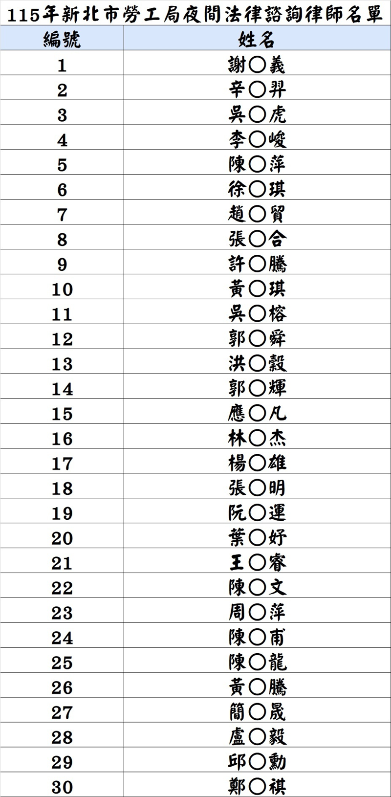 【公告】115年新北市勞工局夜間法律諮詢名單報名