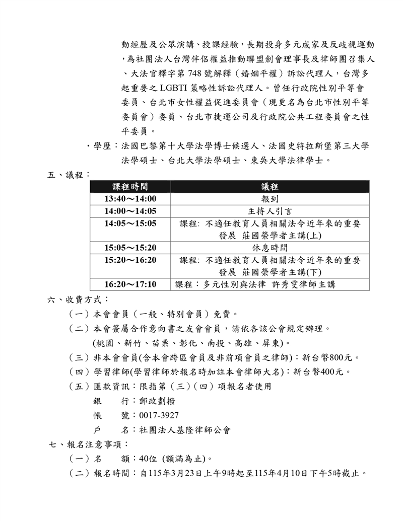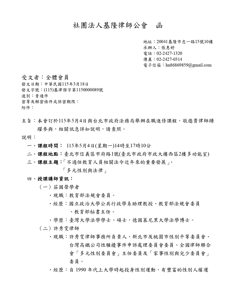 【基律在職進修】115年5月4日與台北市政府法務局舉辦在職進修課程,敬邀各位會員踴躍報名參加。