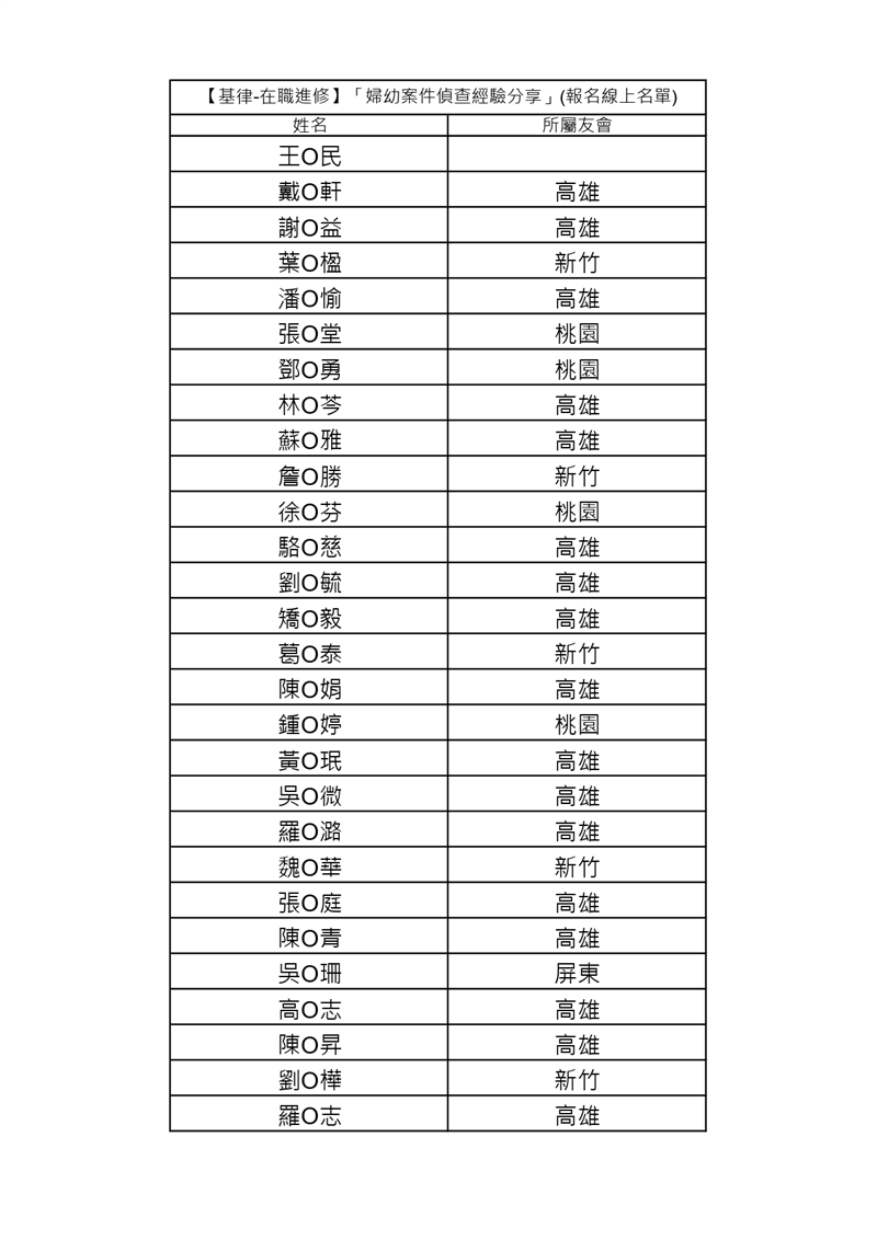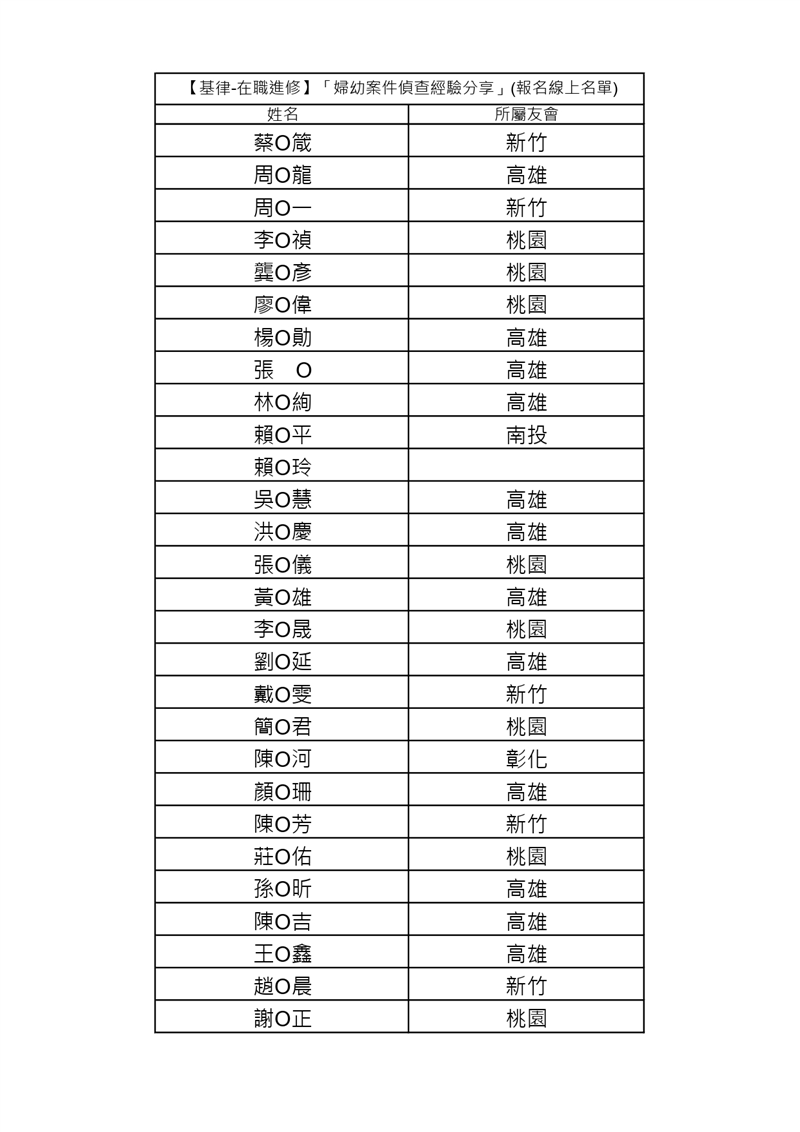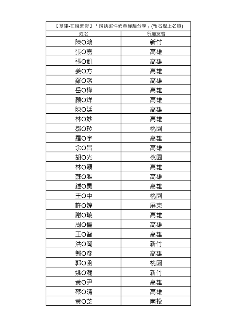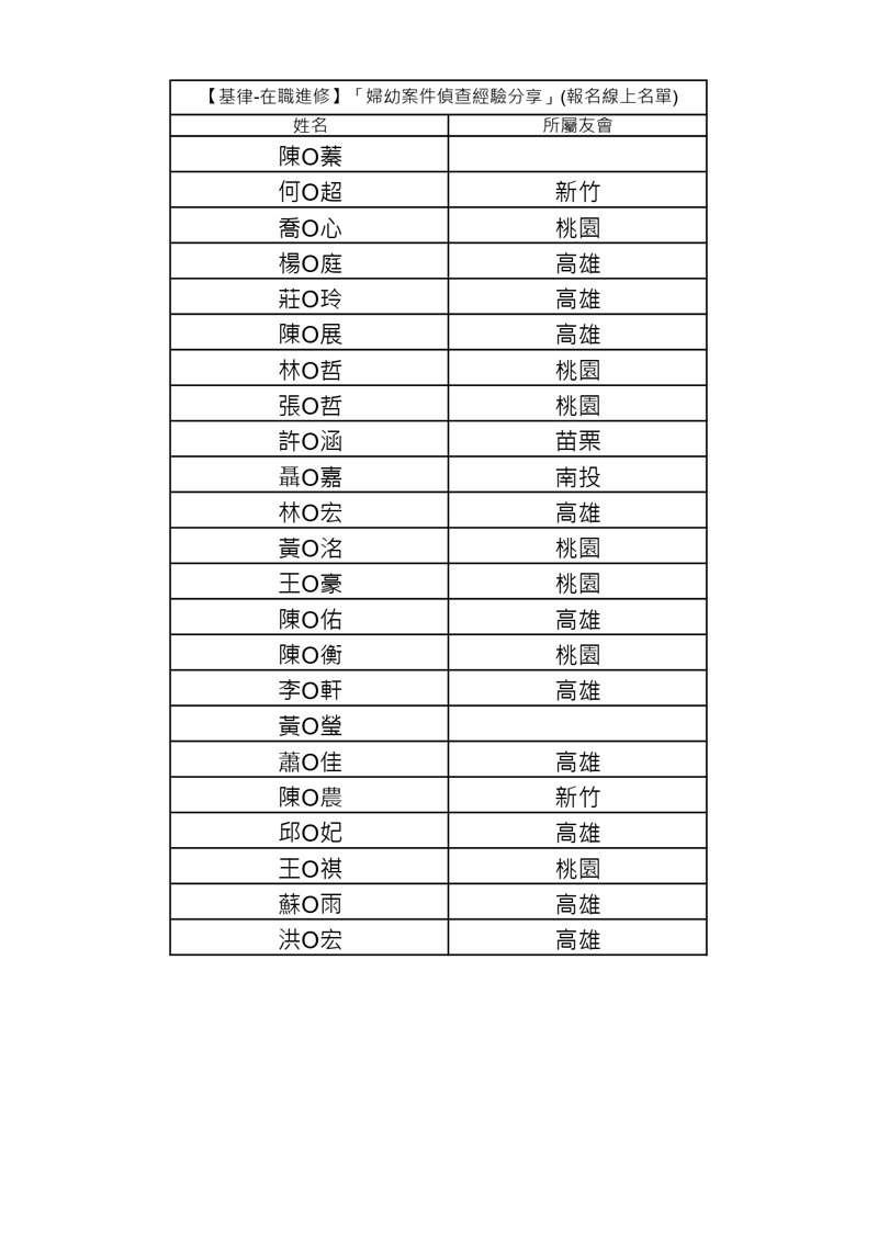 【名單公告】1141101-在職進修【婦幼案件偵查經驗分享】報名線上名單