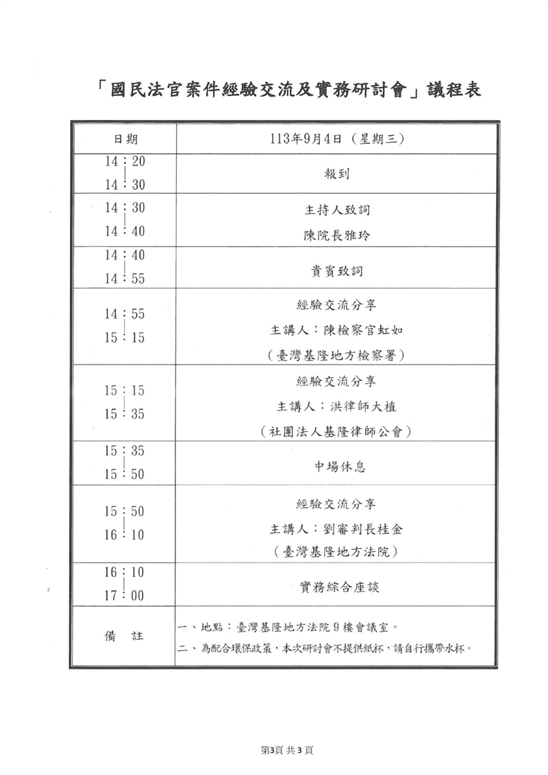 臺灣基隆地方法院訂於113年9月4日(星期三)舉辦「國民法官案件經驗交流及實務研討會」邀請會員一同參與,相關資訊如下所示,請有興趣的會員點選報名連結網址報名。